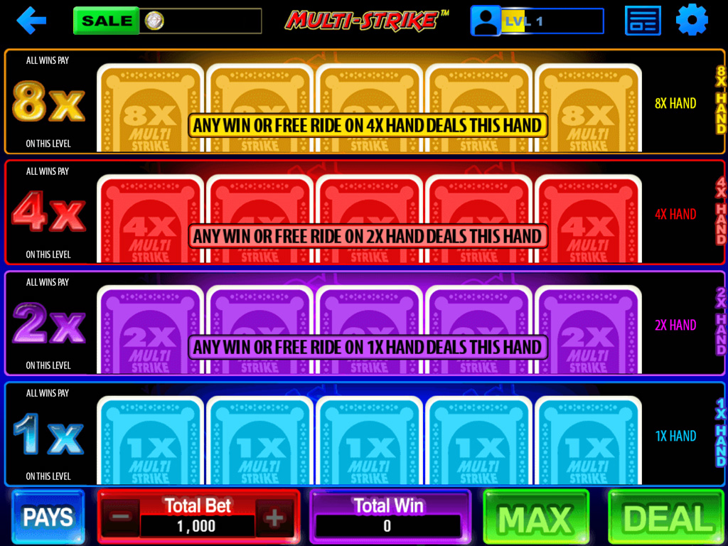 In Multi-Strike Poker, you play the first hand of up to four possible separate hands of video poker using the standard pay table. With a winning hand, the heart-pounding excitement continues with a new deal from a fresh deck and double the pay table value on the second rung. You will love the chance to climb to the summit by winning three hands in a row, because the top paytable lavishes 8 times the payout for a chance at 32,000 points for a royal flush (when playing 5 points per hand)!